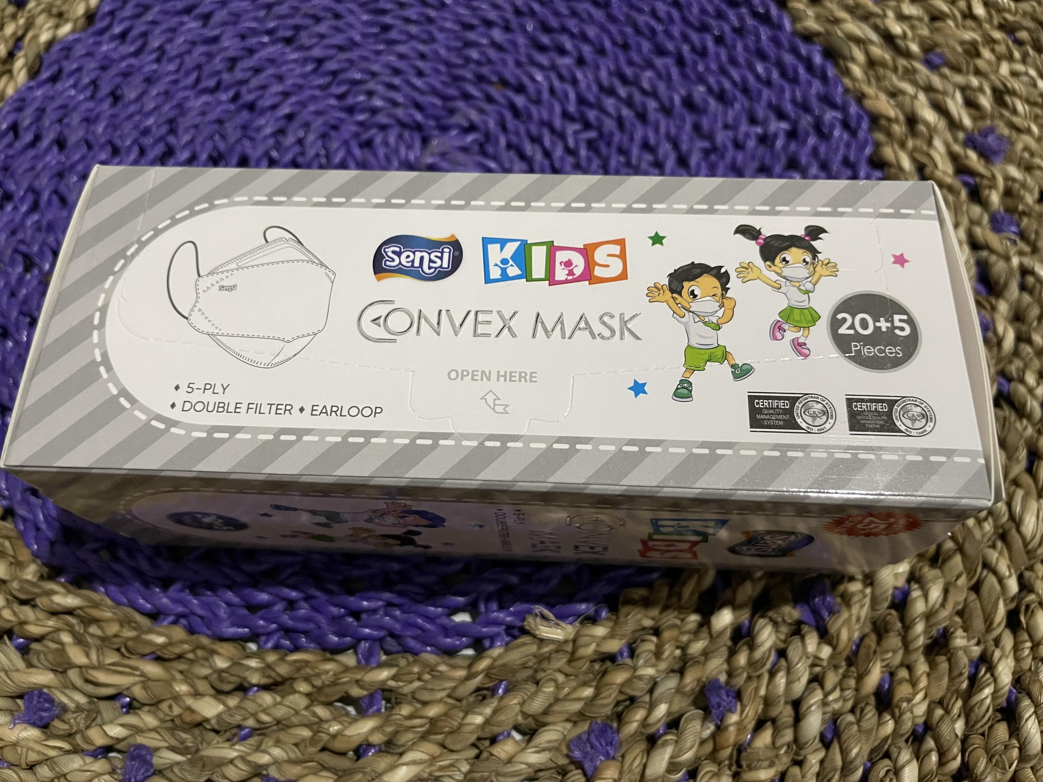 Masker Sensi Convex khusus anak-anak, isi 25 pcs. Desain 3D convex yang nyaman untuk wajah anak, sirkulasi udara baik.