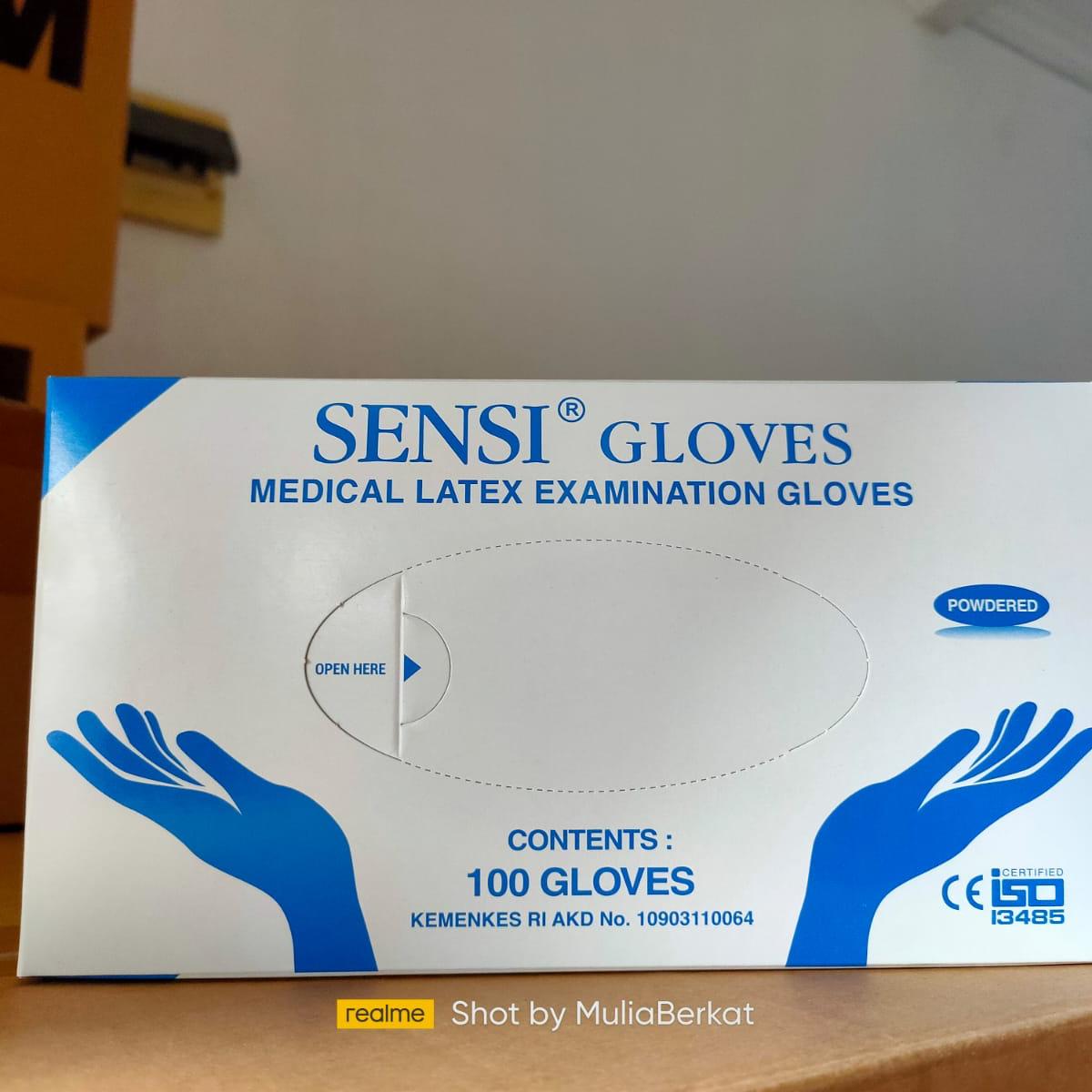 Sarung tangan latex merk Sensi, disposable. Cocok untuk keperluan medis, laboratorium, dan food handling. Elastis dan fit di tangan.