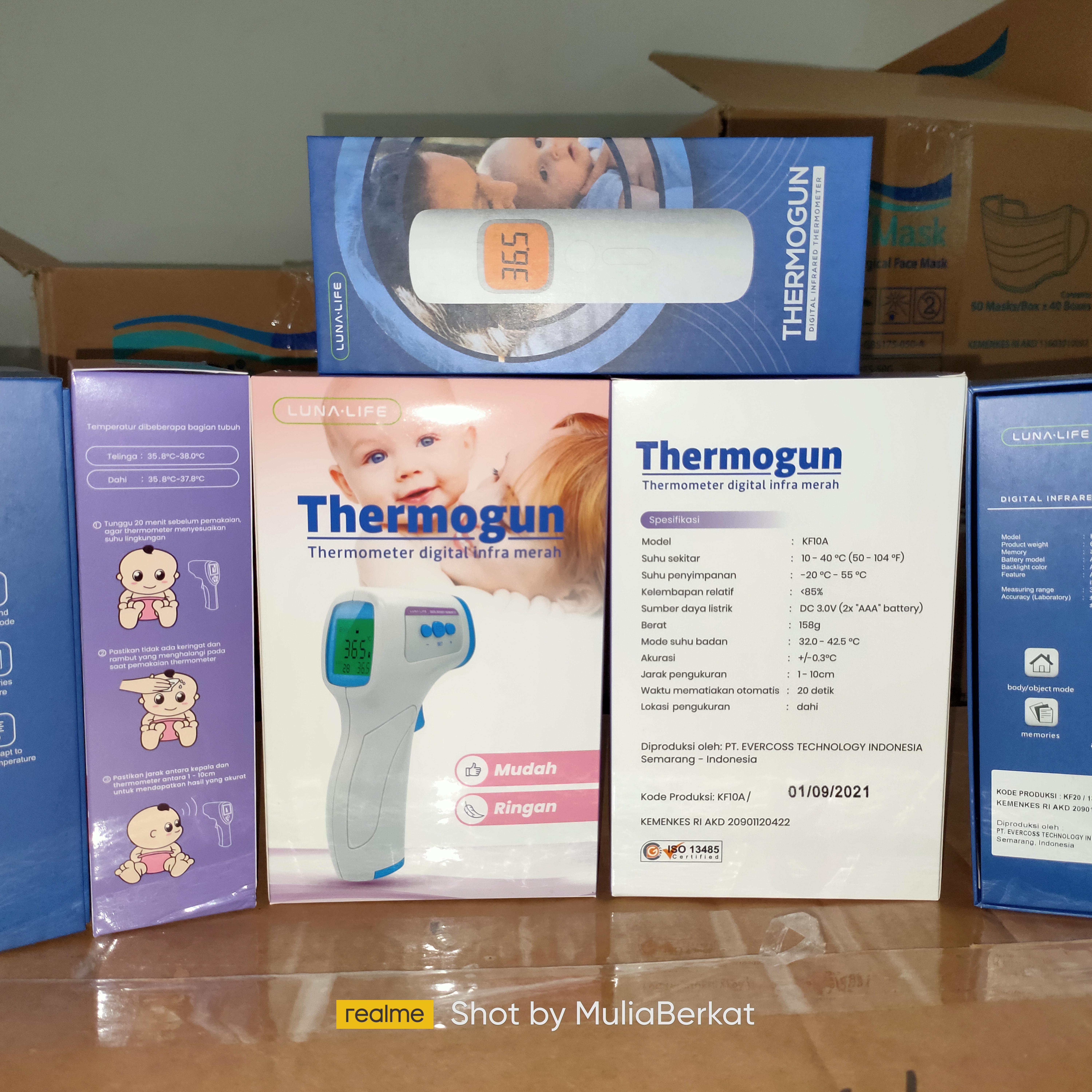 Thermometer gun infrared KF10 merk LunaLife. Non-contact, hasil pengukuran cepat dan akurat. Cocok untuk screening suhu tubuh di pintu masuk.